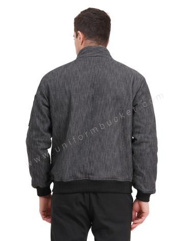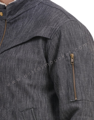 STYLE- male black denim jacket with front cross pleat & front zip sleeve & bottom rib