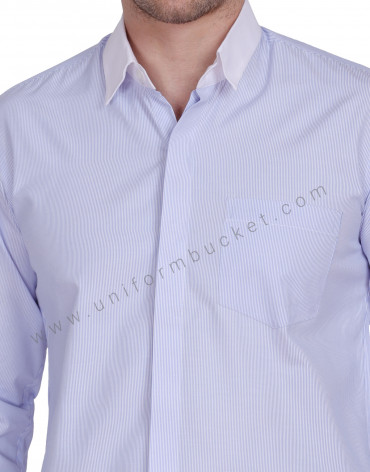 BLUE & WHITE LINING MALE FORMAL SHIRT WITH HIDDEN PLACKET This blend of polyester-cotton fabric is comfortable to wear due to the added stretch and breathable cotton yarns. Finished with a button-down closure this style is ready to go. Uniform Bucket Range of MEN’S corporate Shirts are made up of fine quality fabric and export quality stitching that will give you a Smart look with comfort while at the office. Club it with contrast trousers to give it a perfect look.